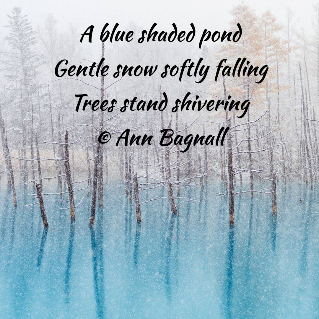 January 11, 2022September 24, 2022 A blue shaded pondGentle snow softly fallingTrees stand shivering Share this: Click to email a link to a friend (Opens in new window) Email Tweet Click to print (Opens in new window) Print Like Loading... Related