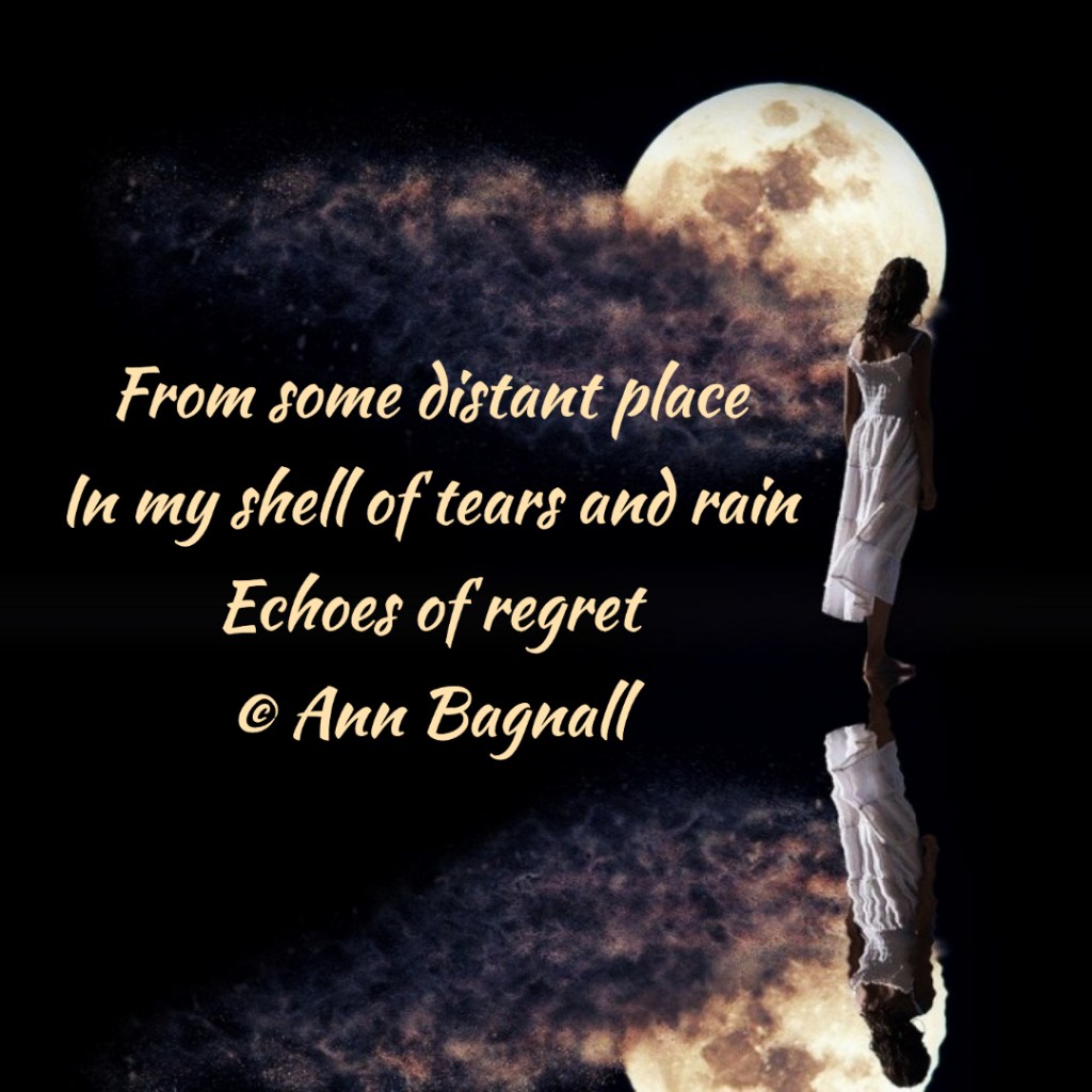 January 29, 2022September 24, 2022 From some distant placeIn my shell of tears and rainEchoes of regret Share this: Click to email a link to a friend (Opens in new window) Email Tweet Click to print (Opens in new window) Print Like Loading... Related