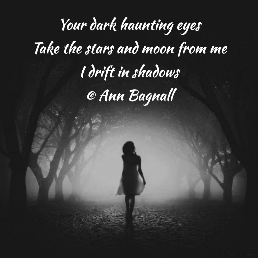 January 29, 2022September 24, 2022 Your dark haunting eyesTake the stars and moon from meI drift in shadows Share this: Email a link to a friend (Opens in new window) Email Tweet Print (Opens in new window) Print Like Loading... Related