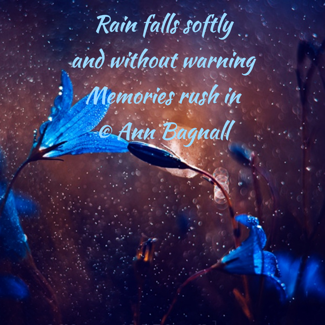 February 7, 2022February 6, 2022 Rain falls softly and without warning Memories rush in © Ann Bagnall Share this: Click to email a link to a friend (Opens in new window) Email Tweet Click to print (Opens in new window) Print Like Loading... Related