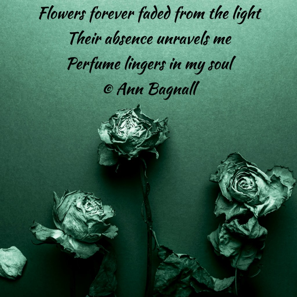February 11, 2022February 6, 2022 Flowers forever faded from the light Their absence unravels me Perfume lingers in my soul © Ann Bagnall Share this: Email a link to a friend (Opens in new window) Email Tweet Print (Opens in new window) Print Like Loading... Related