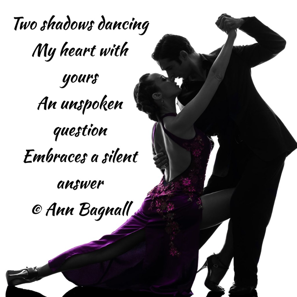 February 17, 2022February 6, 2022 Two shadows dancing my heart with yours An unspoken question Embraces a silent answer © Ann Bagnall Share this: Email a link to a friend (Opens in new window) Email Tweet Print (Opens in new window) Print Like Loading... Related