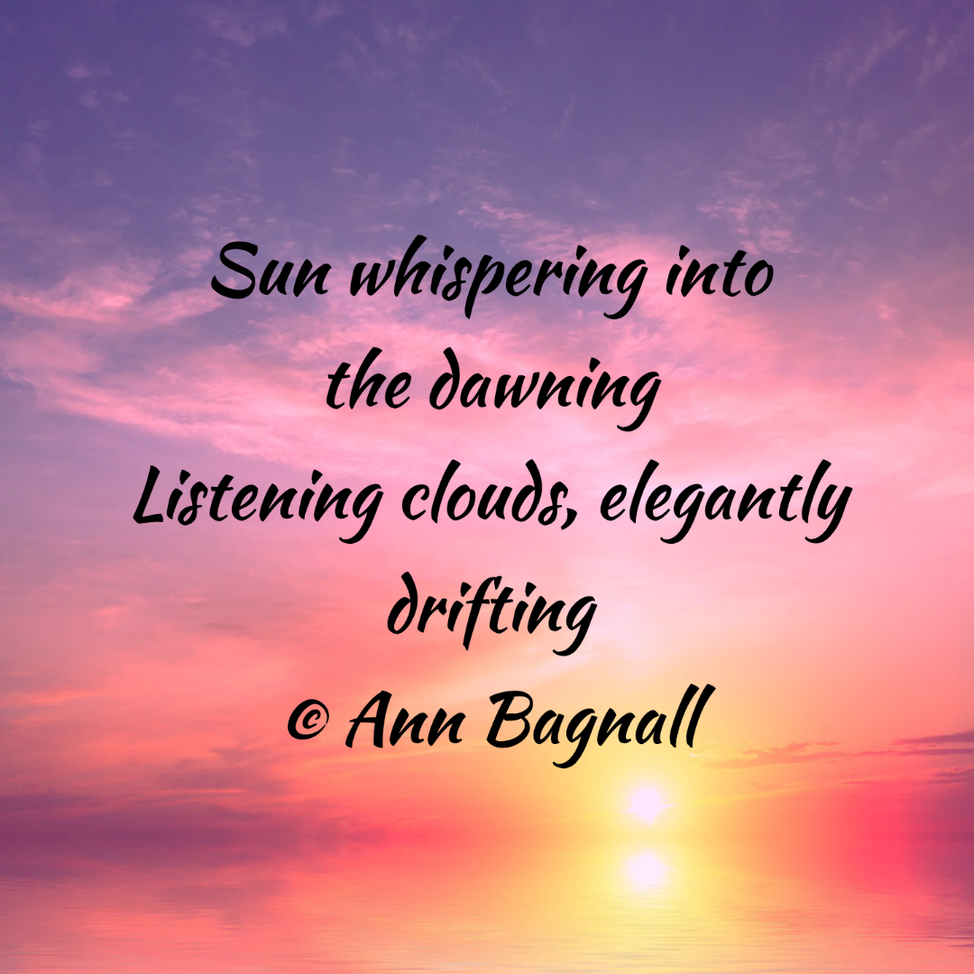March 1, 2022February 6, 2022 Sun whispering into the dawning Listening clouds Elegantly drifting © Ann Bagnall Share this: Click to email a link to a friend (Opens in new window) Email Tweet Click to print (Opens in new window) Print Like Loading... Related