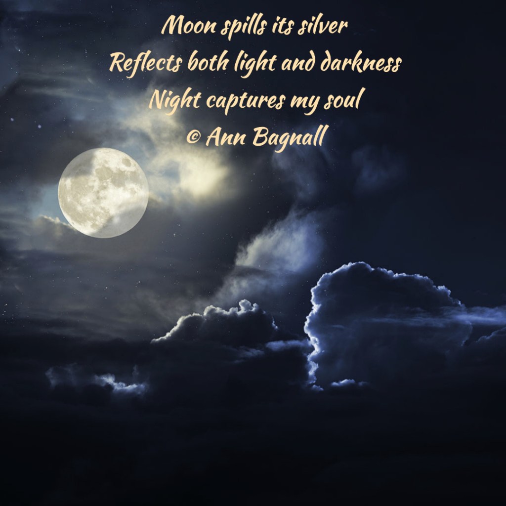 April 1, 2022March 6, 2022 Moon spills its silverReflects both light and darknessNight captures my soul © Ann Bagnall Share this: Click to email a link to a friend (Opens in new window) Email Tweet Click to print (Opens in new window) Print Like Loading... Related