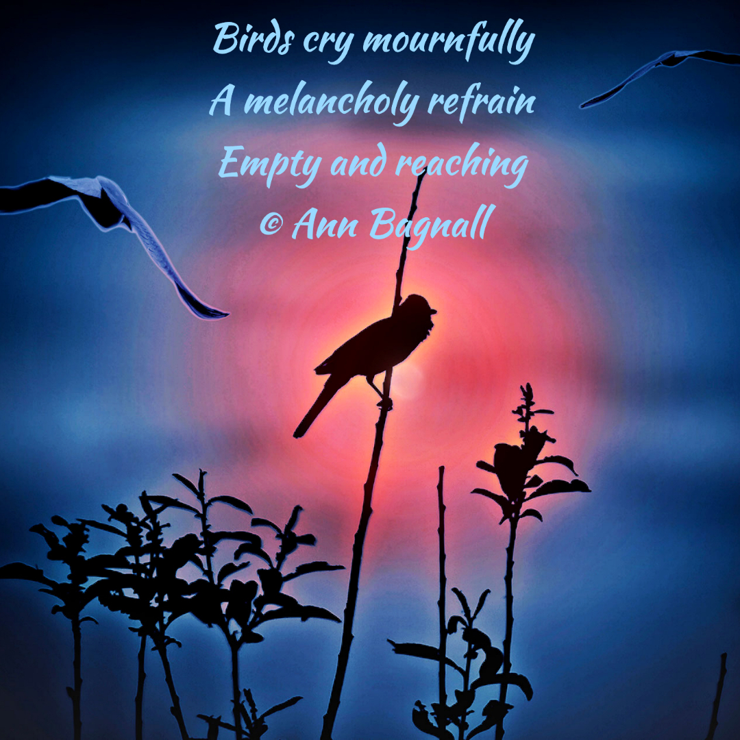 April 3, 2022March 6, 2022 Birds cry mournfullyA melancholy refrainEmpty and reaching © Ann Bagnall Share this: Email a link to a friend (Opens in new window) Email Tweet Print (Opens in new window) Print Like Loading... Related