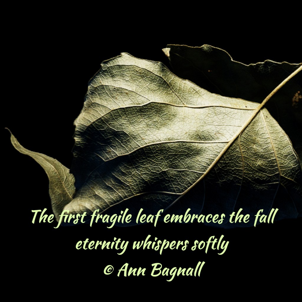 April 9, 2022March 6, 2022 The first fragile leaf embraces the falleternity whispers softly© Ann Bagnall Share this: Email a link to a friend (Opens in new window) Email Tweet Print (Opens in new window) Print Like Loading... Related