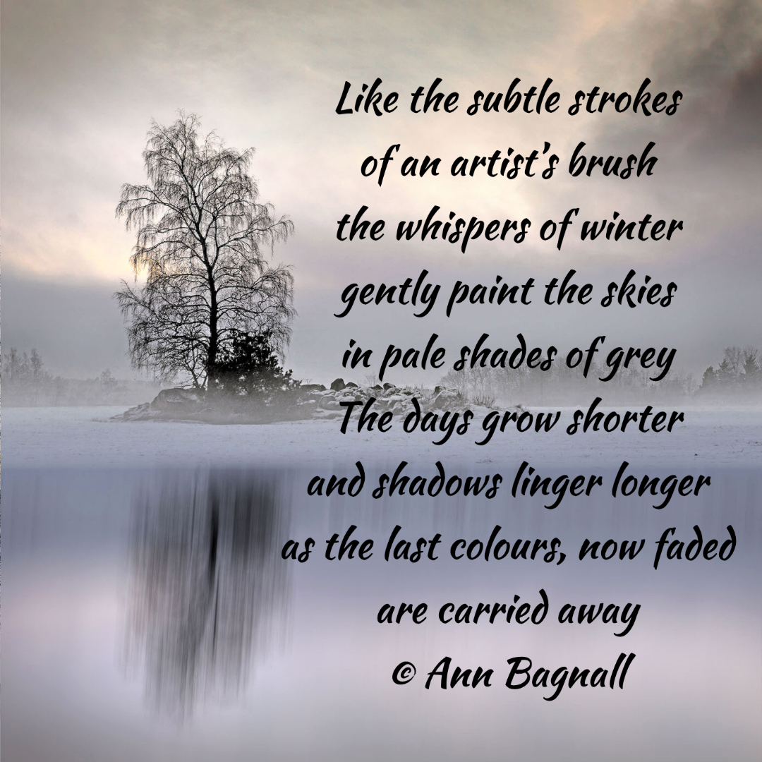 April 11, 2022March 13, 2022 Like the subtle strokesof an artist’s brushthe whispers of wintergently paint the skiesin pale shades of greyThe days grow shorterand shadows linger longeras the last colours, now fadedare carried away© Ann Bagnall Share this: Email a link to a friend (Opens in new window) Email Tweet Print (Opens in new window) Print Like Loading... Related