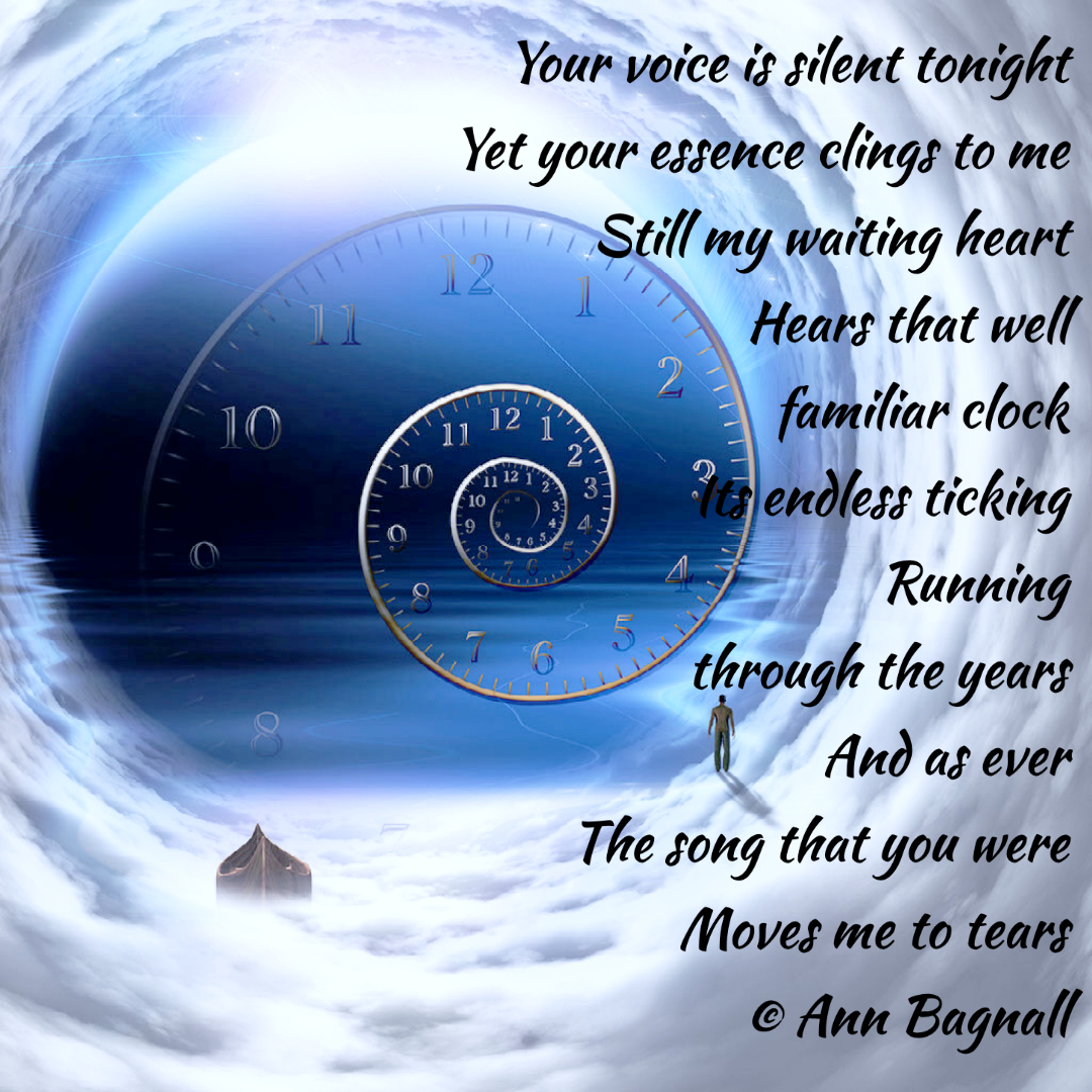 April 18, 2022March 21, 2022 Your voice is silent tonightYet your essence clings to meStill my waiting heartHears that wellfamiliar clockIts endless tickingRunningthrough the yearsAnd as everThe song that you wereMoves me to tears© Ann Bagnall Share this: Click to email a link to a friend (Opens in new window) Email Tweet Click to print (Opens in new window) Print Like Loading... Related