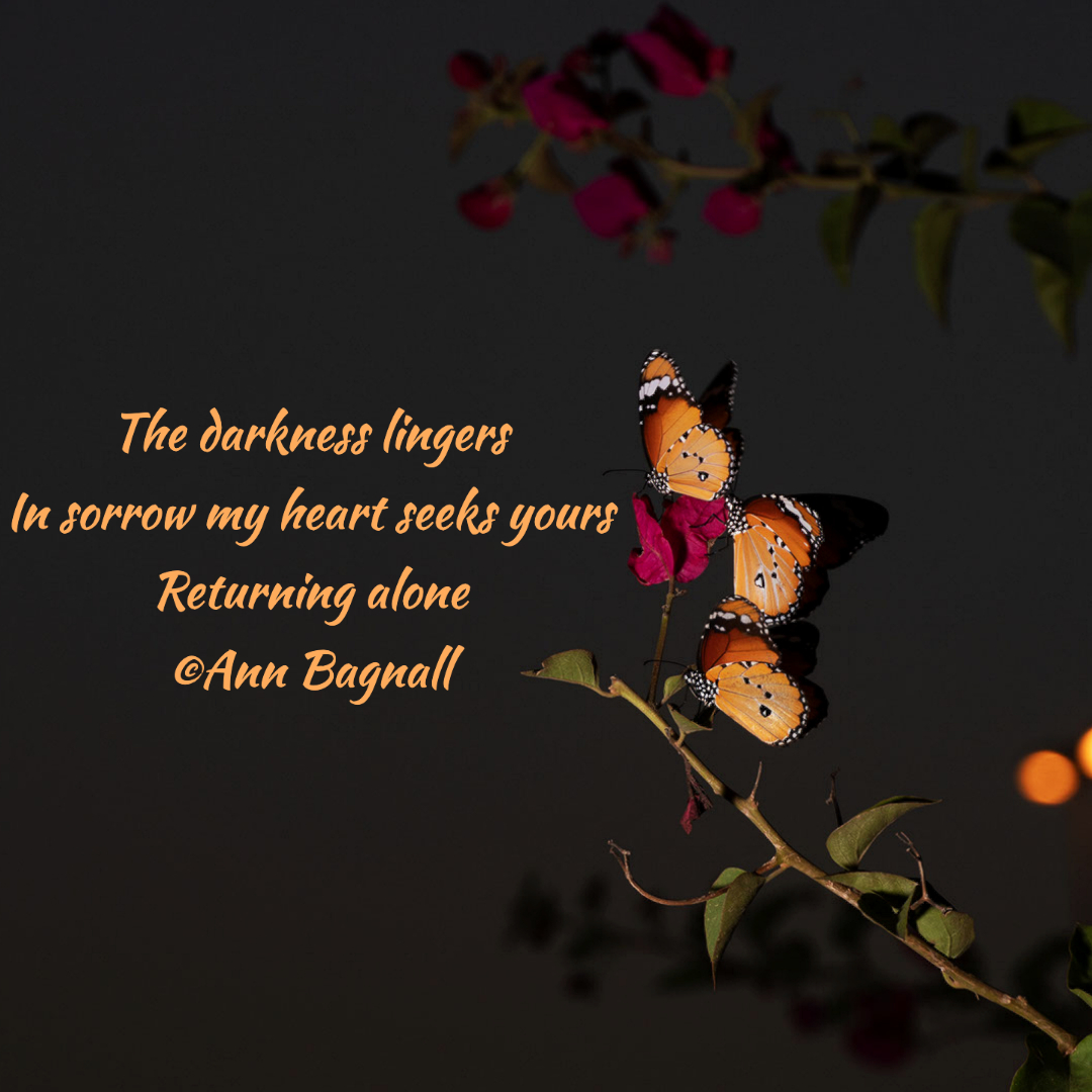 April 22, 2022March 21, 2022 The darkness lingersIn sorrow my heart seeks yoursReturning alone©Ann Bagnall Share this: Click to email a link to a friend (Opens in new window) Email Tweet Click to print (Opens in new window) Print Like Loading... Related