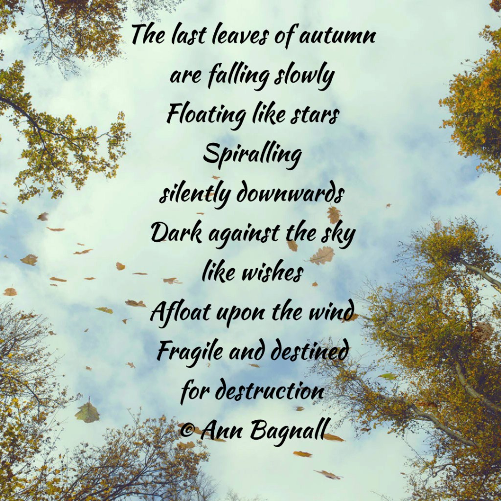 April 29, 2022April 13, 2022 The last leaves of autumnare falling slowlyFloating like starsSpirallingsilently downwardsDark against the skylike wishesAfloat upon the windFragile and destinedfor destruction© Ann Bagnall Share this: Click to email a link to a friend (Opens in new window) Email Tweet Click to print (Opens in new window) Print Like Loading... Related