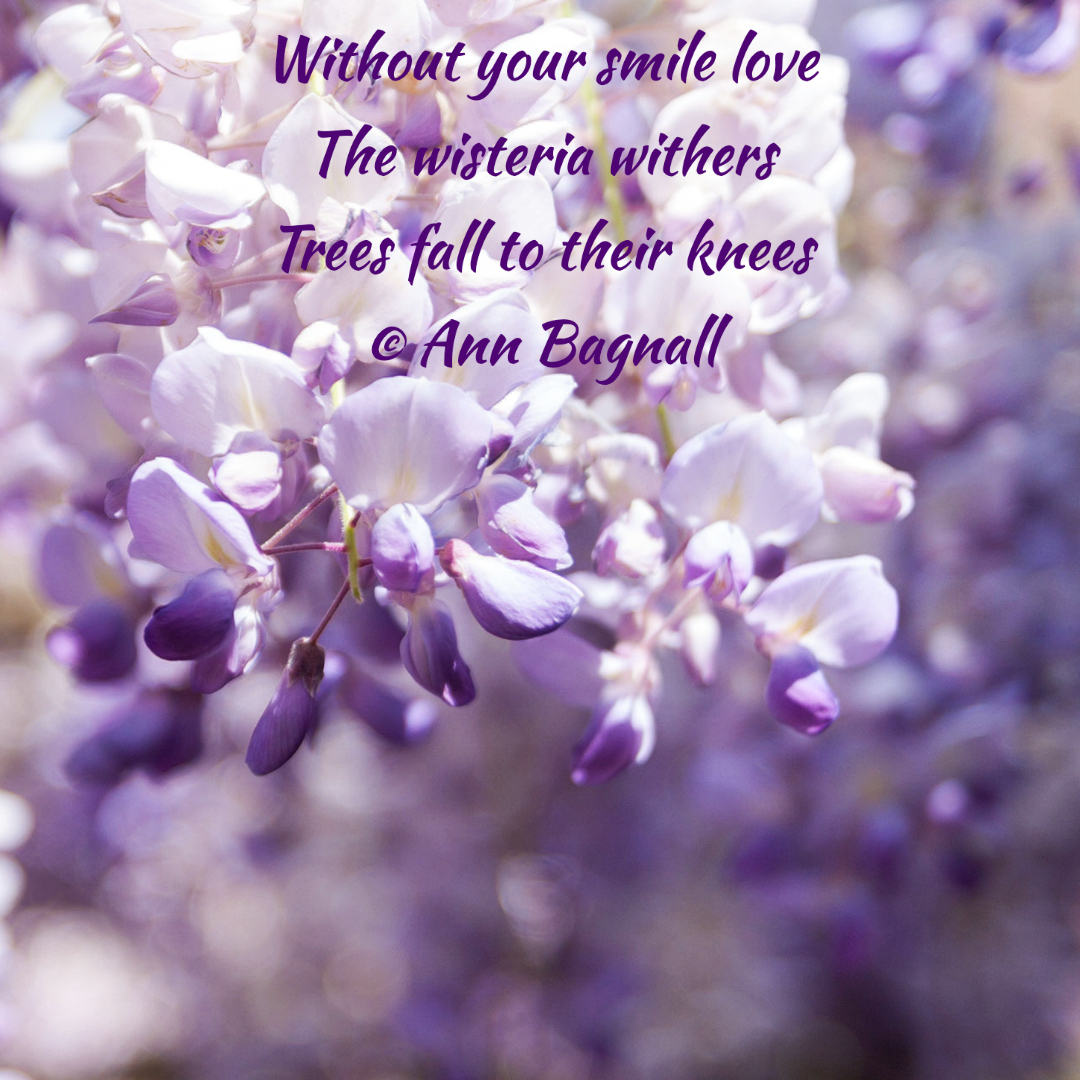May 17, 2022April 25, 2022 Without your smile love The wisteria withers Trees fall to their knees © Ann Bagnall Share this: Click to email a link to a friend (Opens in new window) Email Tweet Click to print (Opens in new window) Print Like Loading... Related