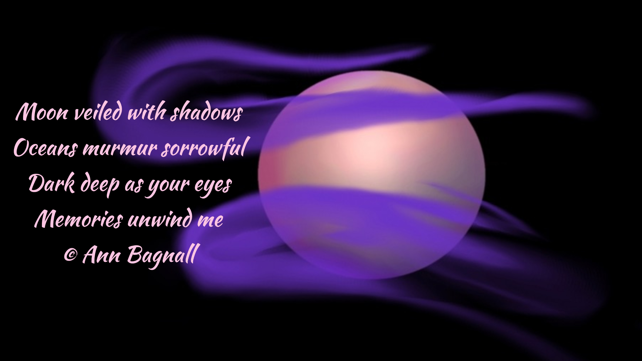 May 21, 2022January 10, 2025 Moon veiled with shadows oceans murmur sorrowful dark deep as your eyes memories unwind me © Ann Bagnall Share this: Click to email a link to a friend (Opens in new window) Email Tweet Click to print (Opens in new window) Print Like Loading... Related