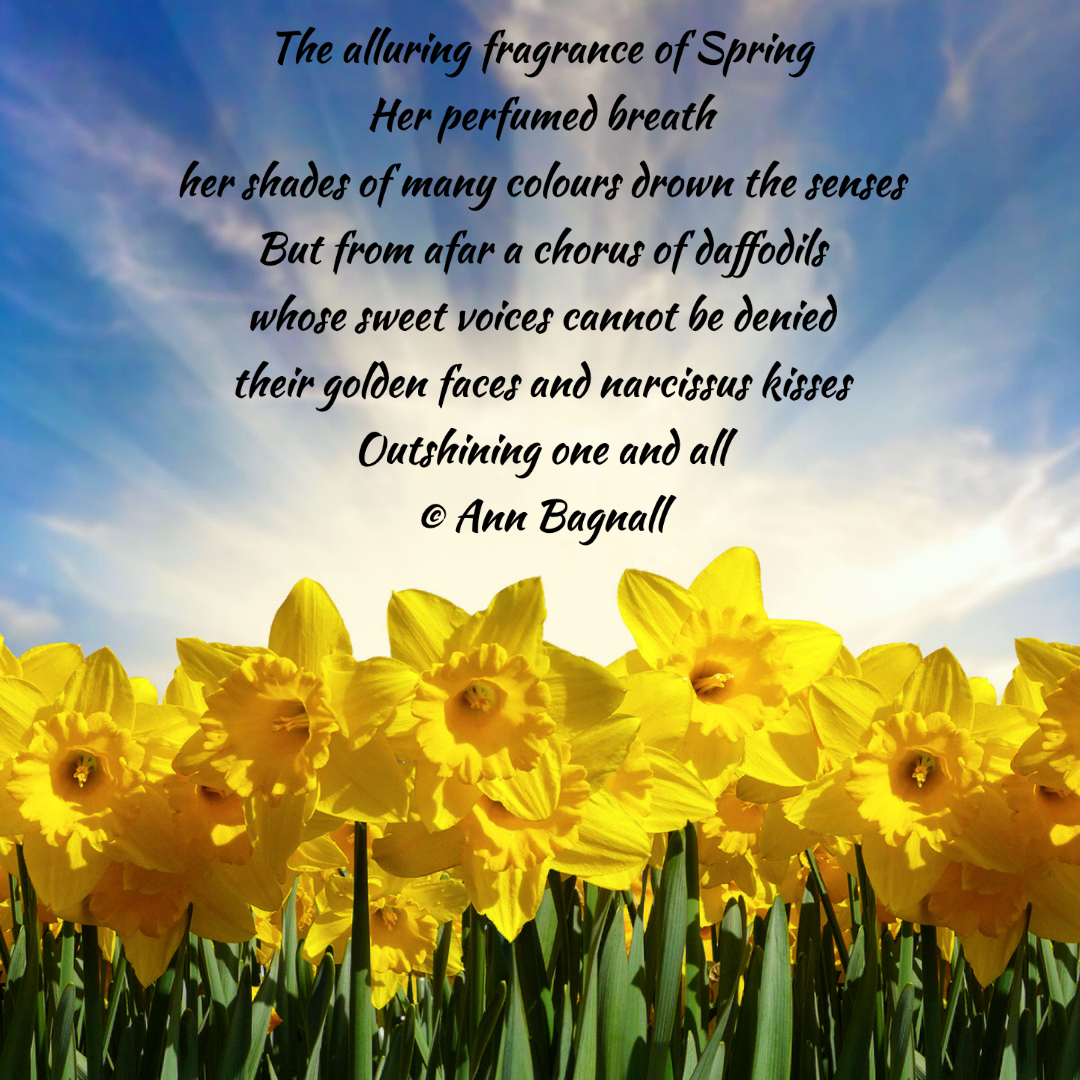 May 24, 2022April 27, 2022 The alluring fragrance of SpringHer perfumed breathher shades of many coloursdrown the sensesBut from afara chorus of daffodilswhose sweet voicescannot be deniedtheir golden facesand narcissus kissesOutshining one and all© Ann Bagnall Share this: Email a link to a friend (Opens in new window) Email Tweet Print (Opens in new window) Print Like Loading... Related