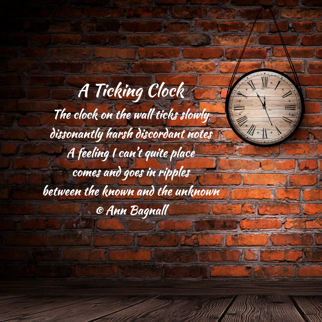 May 25, 2022April 27, 2022 The clock on the wall ticks slowlydissonantly harsh discordant notesA feeling I can’t quite placecomes and goes in ripplesbetween the known and the unknown© Ann Bagnall Share this: Email a link to a friend (Opens in new window) Email Tweet Print (Opens in new window) Print Like Loading... Related