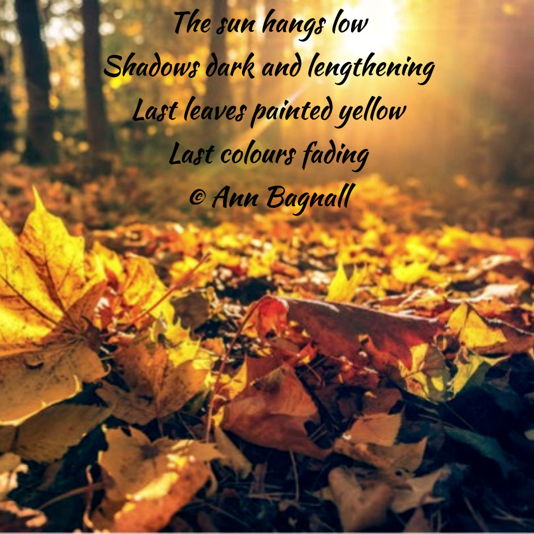May 27, 2022April 27, 2022 The sun hangs lowShadows dark and lengtheningLast leaves painted yellowLast colours fading© Ann Bagnall Share this: Click to email a link to a friend (Opens in new window) Email Tweet Click to print (Opens in new window) Print Like Loading... Related