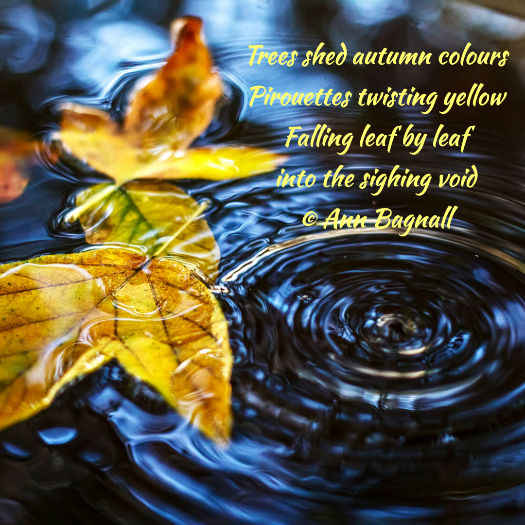 May 28, 2022April 27, 2022 Trees shed autumn coloursPirouettes twisting yellowFalling leaf by leafinto the sighing void© Ann Bagnall Share this: Click to email a link to a friend (Opens in new window) Email Tweet Click to print (Opens in new window) Print Like Loading... Related