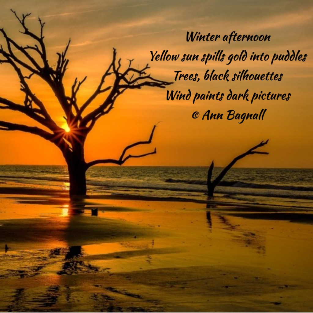 May 28, 2022April 27, 2022 Winter afternoonYellow sun spills gold into puddlesTrees, black silhouettesWind paints dark pictures© Ann Bagnall Share this: Click to email a link to a friend (Opens in new window) Email Tweet Click to print (Opens in new window) Print Like Loading... Related