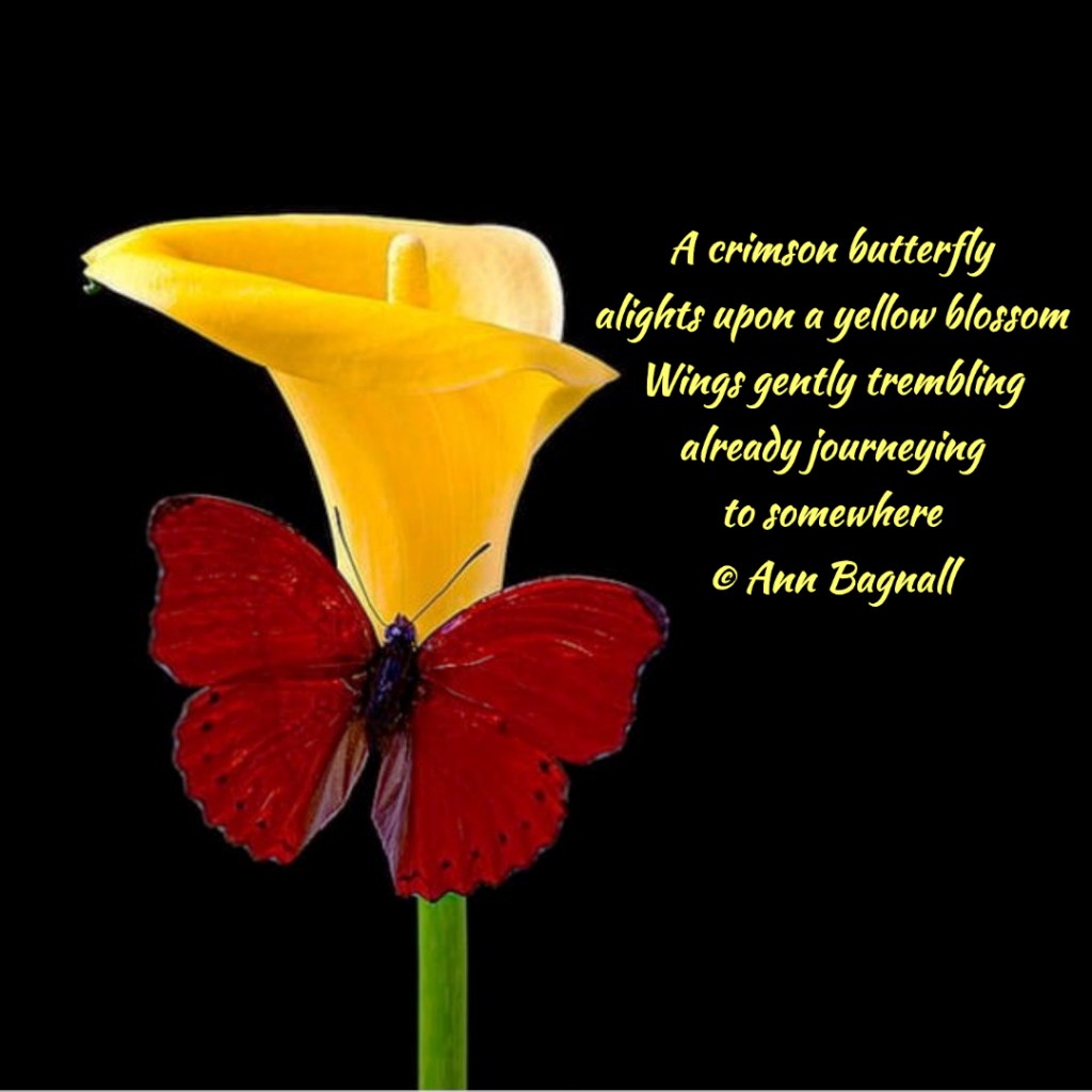 May 29, 2022April 27, 2022 A crimson butterflyalights upon a yellow blossomWings gently tremblingalready journeyingto somewhere© Ann Bagnall Share this: Click to email a link to a friend (Opens in new window) Email Tweet Click to print (Opens in new window) Print Like Loading... Related
