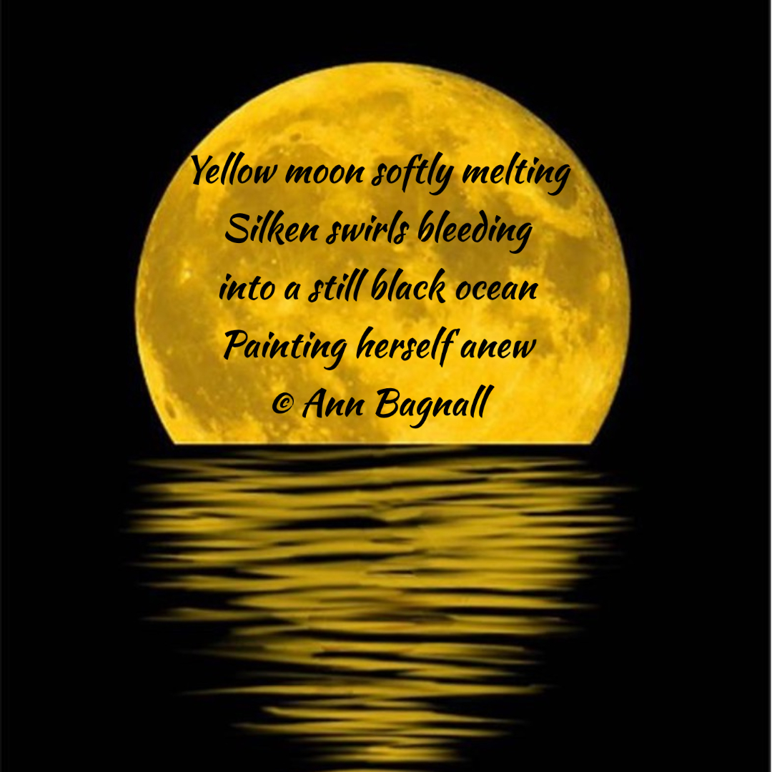 May 29, 2022April 27, 2022 Yellow moon softly meltingSilken swirls bleedinginto a still black oceanpainting herself anew© Ann Bagnall Share this: Click to email a link to a friend (Opens in new window) Email Tweet Click to print (Opens in new window) Print Like Loading... Related