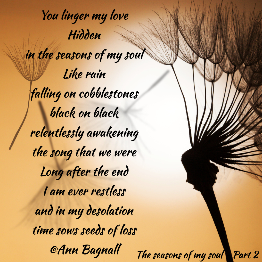 May 30, 2022April 27, 2022 You linger my love hidden in the seasons of my soul Like rain falling on cobblestones black on black relentlessly awakening the song that we were Long after the end I am ever restless and in my desolation time sows seeds of loss ©Ann Bagnall Share this: Email a link to a friend (Opens in new window) Email Tweet Print (Opens in new window) Print Like Loading... Related