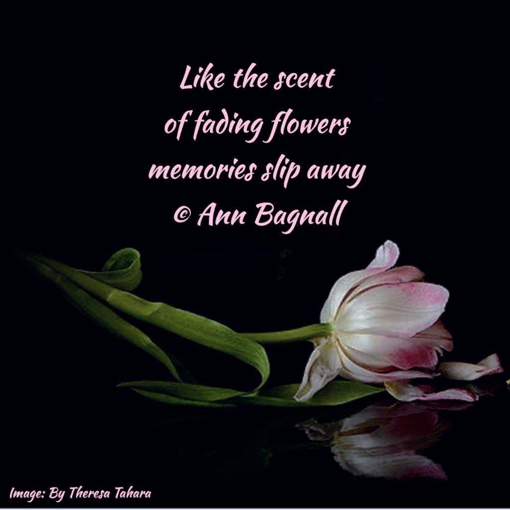 June 23, 2022May 23, 2022 Like the scentOf fading flowersMemories slip away © Ann Bagnall Share this: Click to email a link to a friend (Opens in new window) Email Tweet Click to print (Opens in new window) Print Like Loading... Related