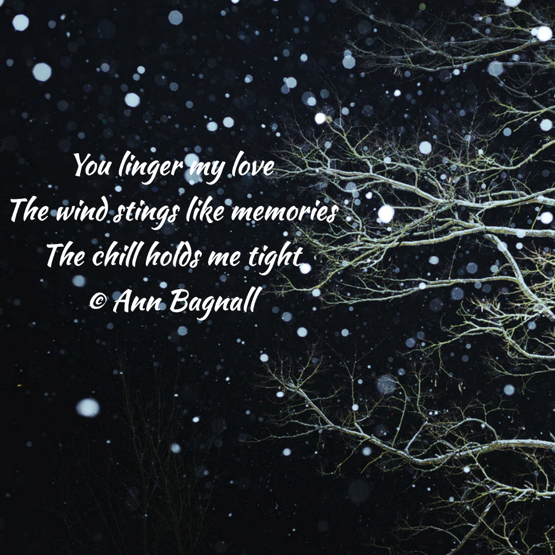 July 4, 2022May 24, 2022 You linger my loveThe wind stings like memoriesThe chill holds me tight© Ann Bagnall Share this: Click to email a link to a friend (Opens in new window) Email Tweet Click to print (Opens in new window) Print Like Loading... Related