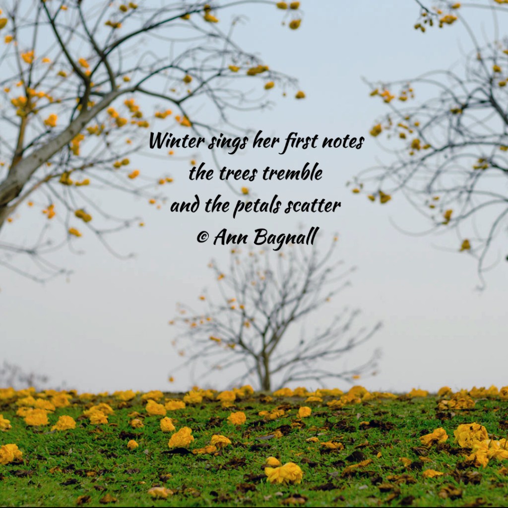 July 20, 2022July 2, 2022 Winter sings her first notesthe trees trembleand the petals scatter© Ann Bagnall Share this: Click to email a link to a friend (Opens in new window) Email Tweet Click to print (Opens in new window) Print Like Loading... Related