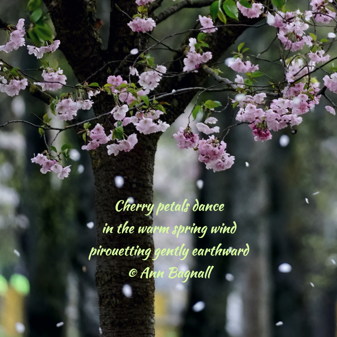 July 20, 2022July 2, 2022 Cherry petals dancein the warm spring windpirouetting gently earthward© Ann Bagnall Share this: Click to email a link to a friend (Opens in new window) Email Tweet Click to print (Opens in new window) Print Like Loading... Related