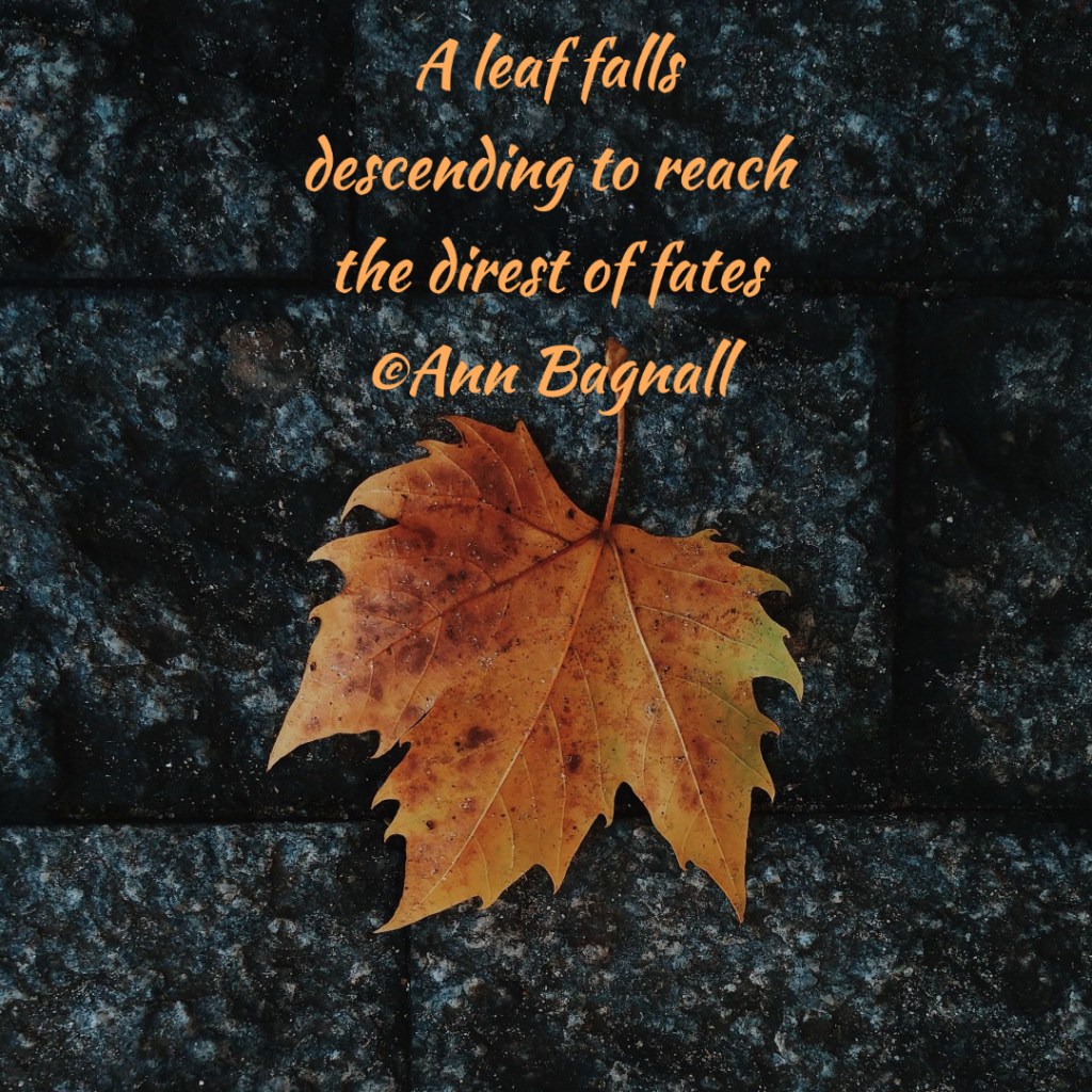 July 27, 2022July 2, 2022 A leaf fallsdescending to reachthe direst of fates©Ann Bagnall Share this: Click to email a link to a friend (Opens in new window) Email Tweet Click to print (Opens in new window) Print Like Loading... Related