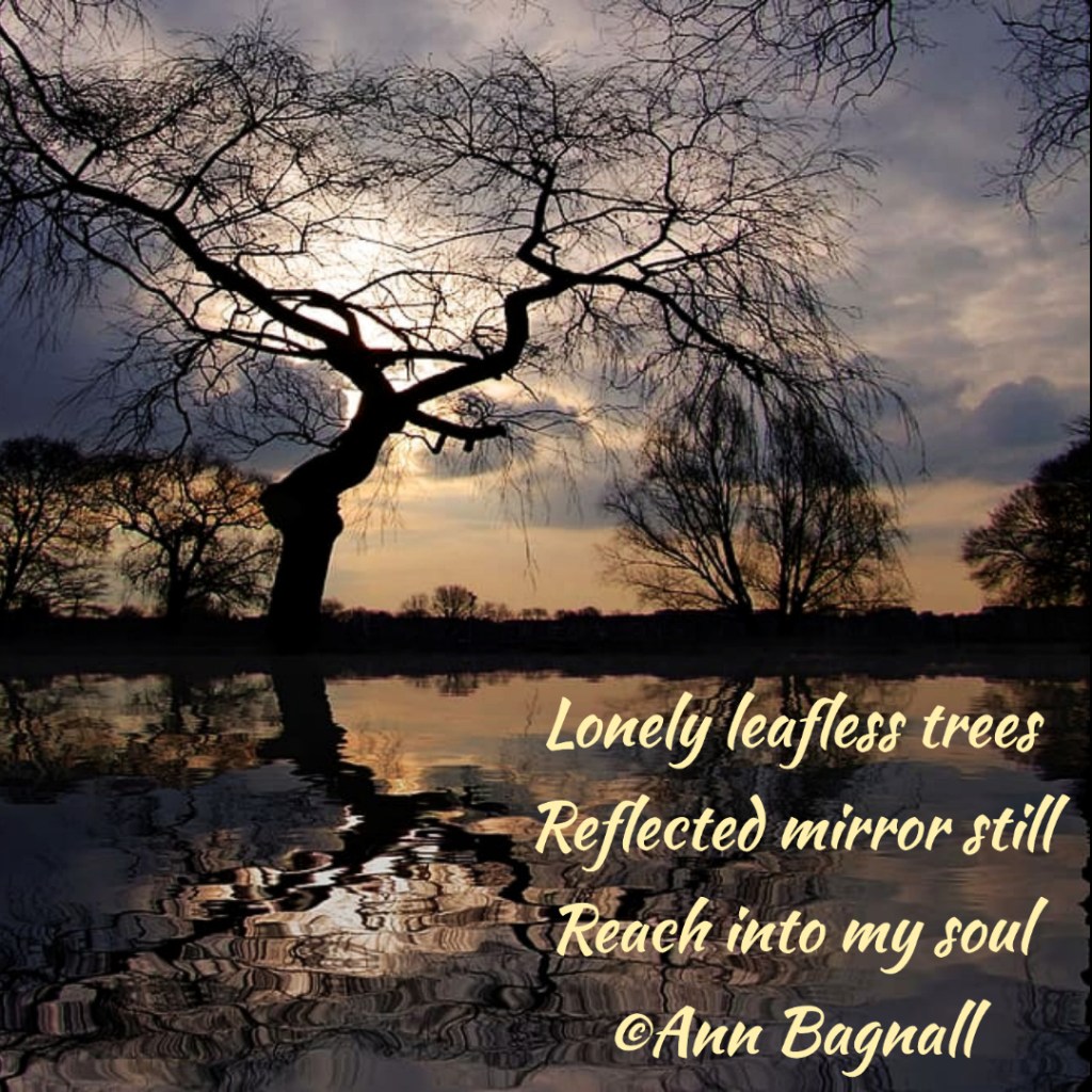 July 27, 2022July 2, 2022 Lonely leafless treesReflected mirror stillReach into my soul©Ann Bagnall Share this: Click to email a link to a friend (Opens in new window) Email Tweet Click to print (Opens in new window) Print Like Loading... Related