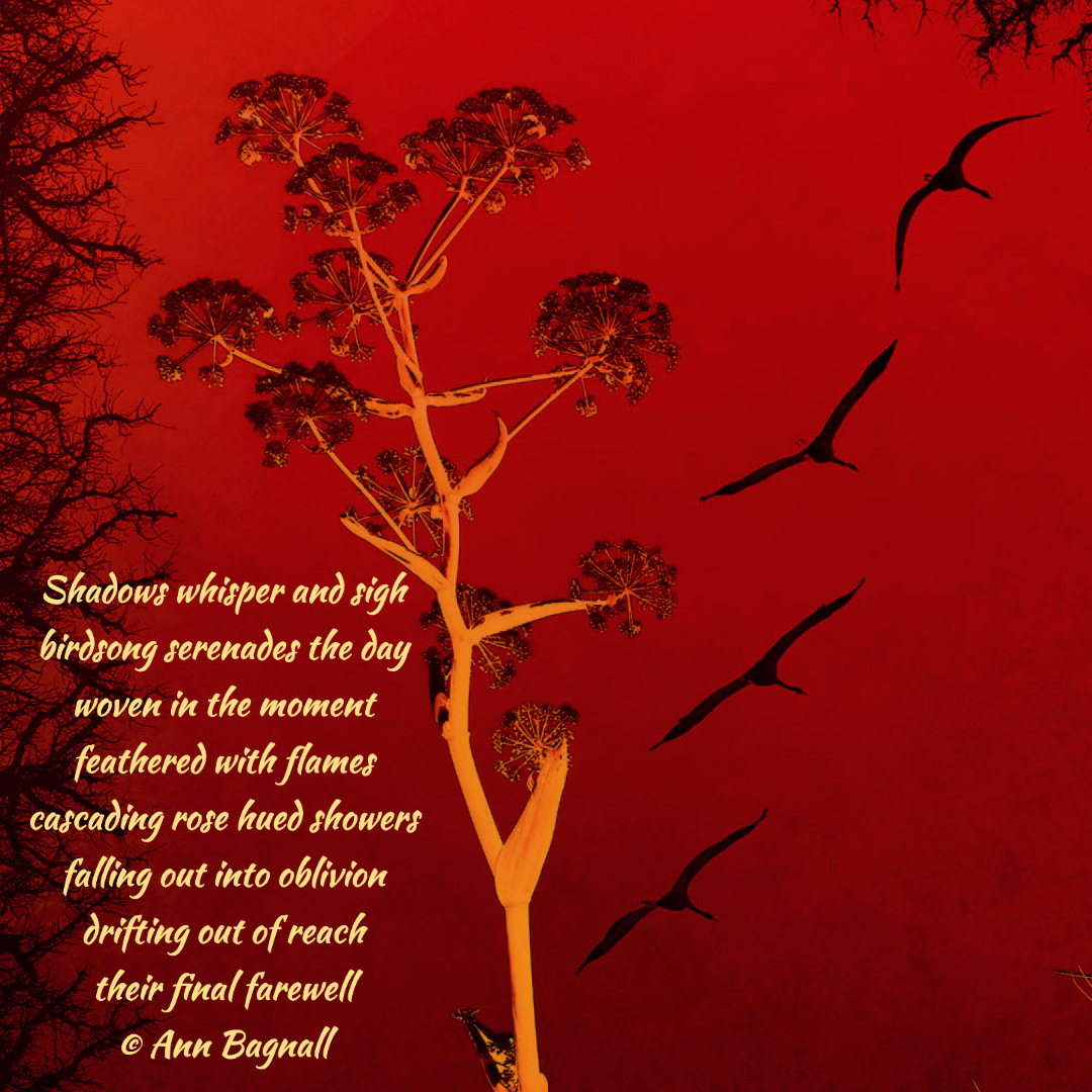 August 4, 2022July 2, 2022 Shadows whisper and sighbirdsong serenades the daywoven in the momentfeathered with flamescascading rose hued showersfalling out into obliviondrifting out of reachtheir final farewell © Ann Bagnall Share this: Click to email a link to a friend (Opens in new window) Email Tweet Click to print (Opens in new window) Print Like Loading... Related