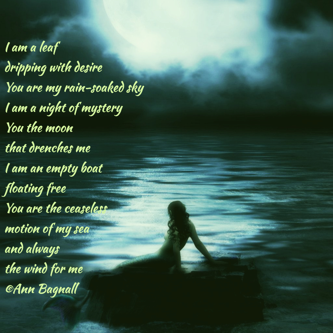 August 11, 2022February 7, 2026 I am a leafdripping with desireYou are my rain-soaked skyI am a night of mysteryYou the moonthat drenches meI am an empty boatfloating freeYou are the ceaselessmotion of my seaand alwaysthe wind for me©Ann Bagnall Share this: Email a link to a friend (Opens in new window) Email Tweet Print (Opens in new window) Print Like Loading... Related