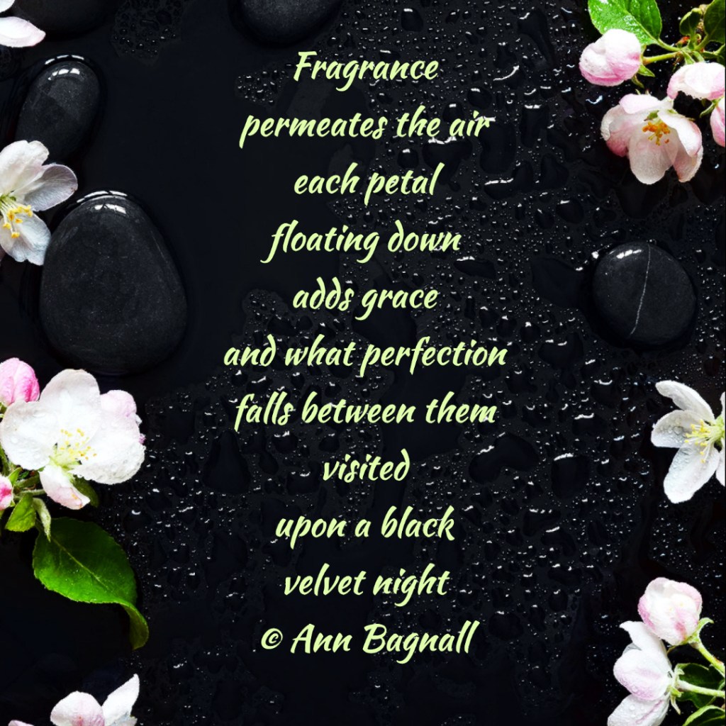 September 3, 2022August 17, 2022 Fragrancepermeates the aireach petalfloating downadds graceand what perfectionfalls between themvisitedupon a blackvelvet night© Ann Bagnall Share this: Click to email a link to a friend (Opens in new window) Email Tweet Click to print (Opens in new window) Print Like Loading... Related