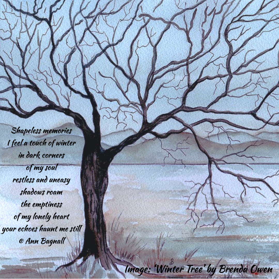 September 8, 2022August 17, 2022 Shapeless memoriesI feel a touch of winterin dark corners of my soulrestless and uneasyshadows roam the emptinessof my lonely heartyour echoes haunt me still © Ann Bagnall Share this: Click to email a link to a friend (Opens in new window) Email Tweet Click to print (Opens in new window) Print Like Loading... Related