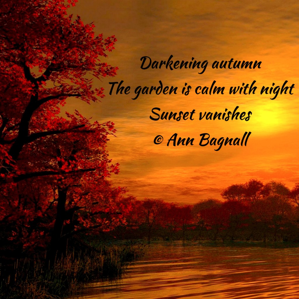September 10, 2022August 18, 2022 Darkening autumnThe garden is calm with nightSunset vanishes© Ann Bagnall Share this: Click to email a link to a friend (Opens in new window) Email Tweet Click to print (Opens in new window) Print Like Loading... Related