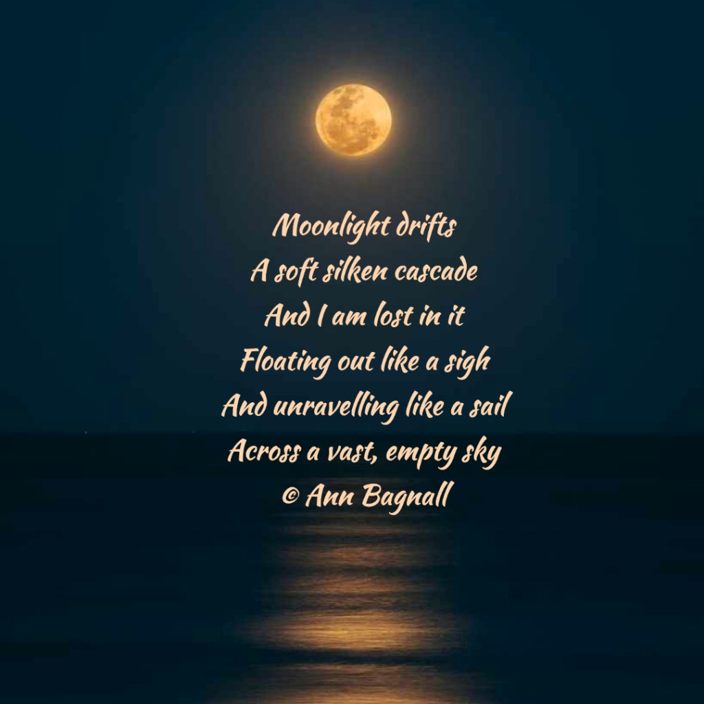 September 15, 2022August 19, 2022 Moonlight driftsA soft silken cascadeAnd I am lost in itFloating out like a sighAnd unravelling like a sailAcross a vast, empty sky© Ann Bagnall Share this: Click to email a link to a friend (Opens in new window) Email Tweet Click to print (Opens in new window) Print Like Loading... Related