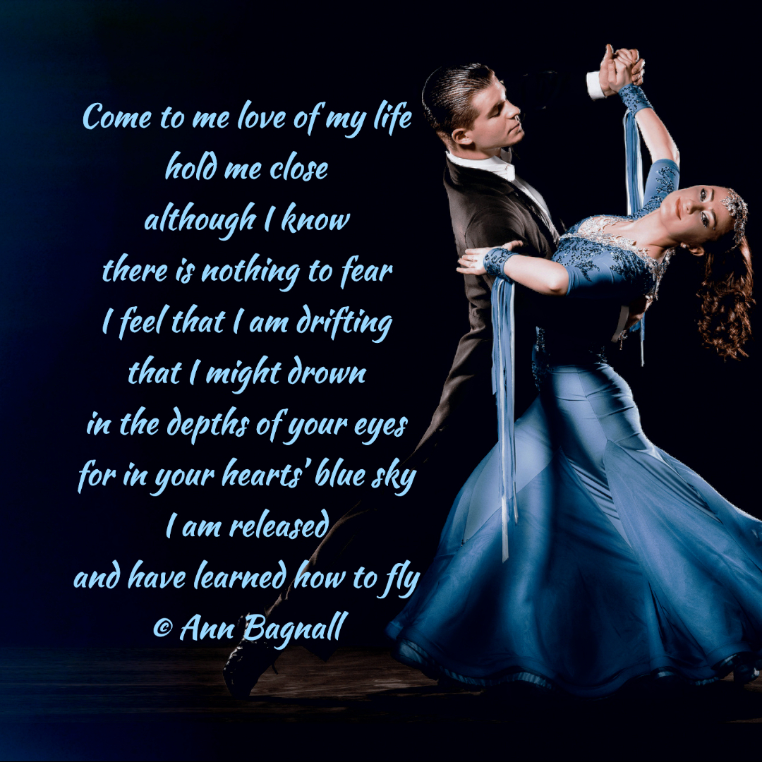 September 25, 2022August 21, 2022 Come to me love of my lifehold me closealthough I knowthere is nothing to fearI feel that I am driftingthat I might drownin the depths of your eyesfor in your hearts’ blue skyI am releasedand have learned how to fly© Ann Bagnall Share this: Click to email a link to a friend (Opens in new window) Email Tweet Click to print (Opens in new window) Print Like Loading... Related