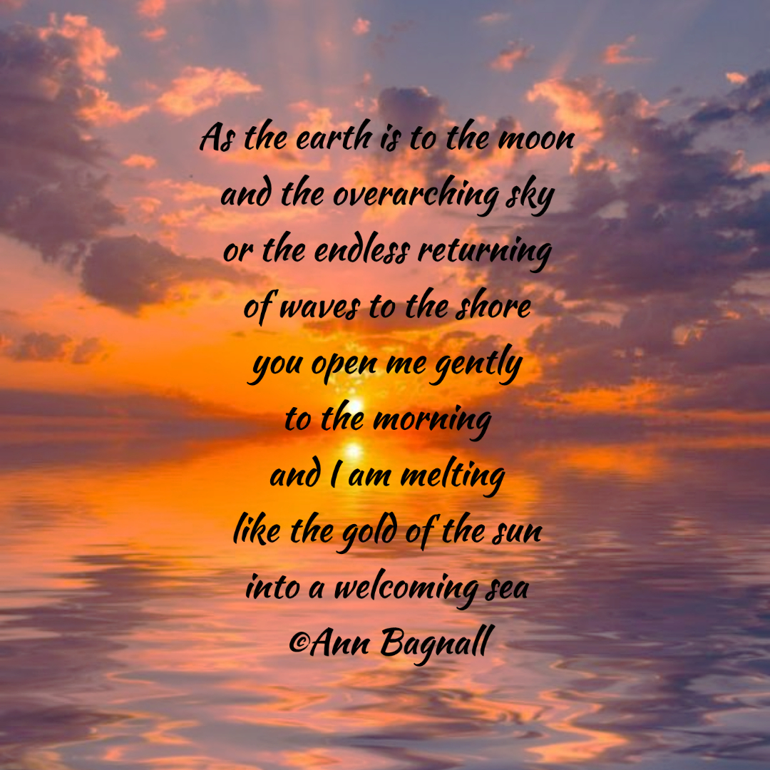 September 27, 2022August 21, 2022 As the earth is to the moonand the overarching skyor the endless returningof waves to the shoreyou open me gentlyto the morningand I am meltinglike the gold of the suninto a welcoming sea©Ann Bagnall Share this: Click to email a link to a friend (Opens in new window) Email Tweet Click to print (Opens in new window) Print Like Loading... Related