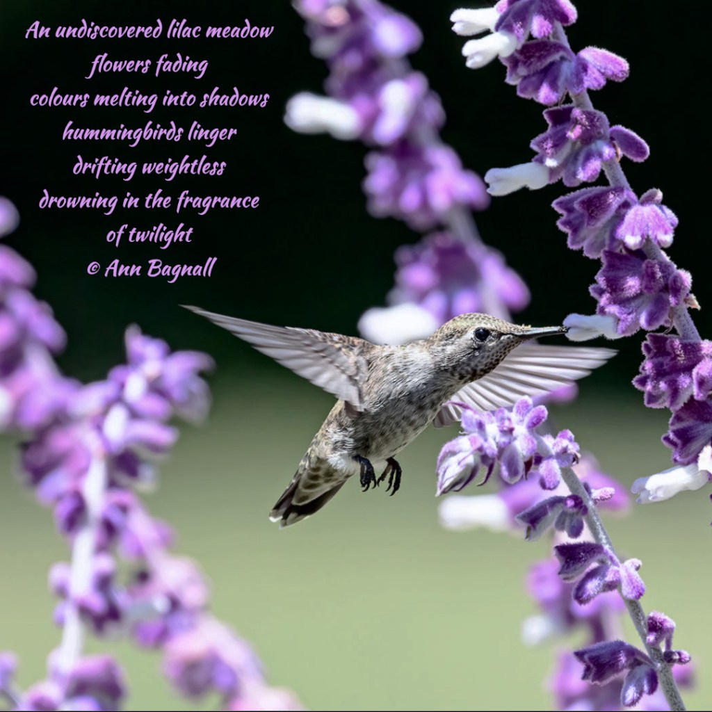 October 4, 2022September 6, 2022 An undiscovered lilac meadowflowers fadingcolours melting into shadowshummingbirds lingerdrifting weightlessdrowning in the fragranceof twilight © Ann Bagnall Share this: Click to email a link to a friend (Opens in new window) Email Tweet Click to print (Opens in new window) Print Like Loading... Related