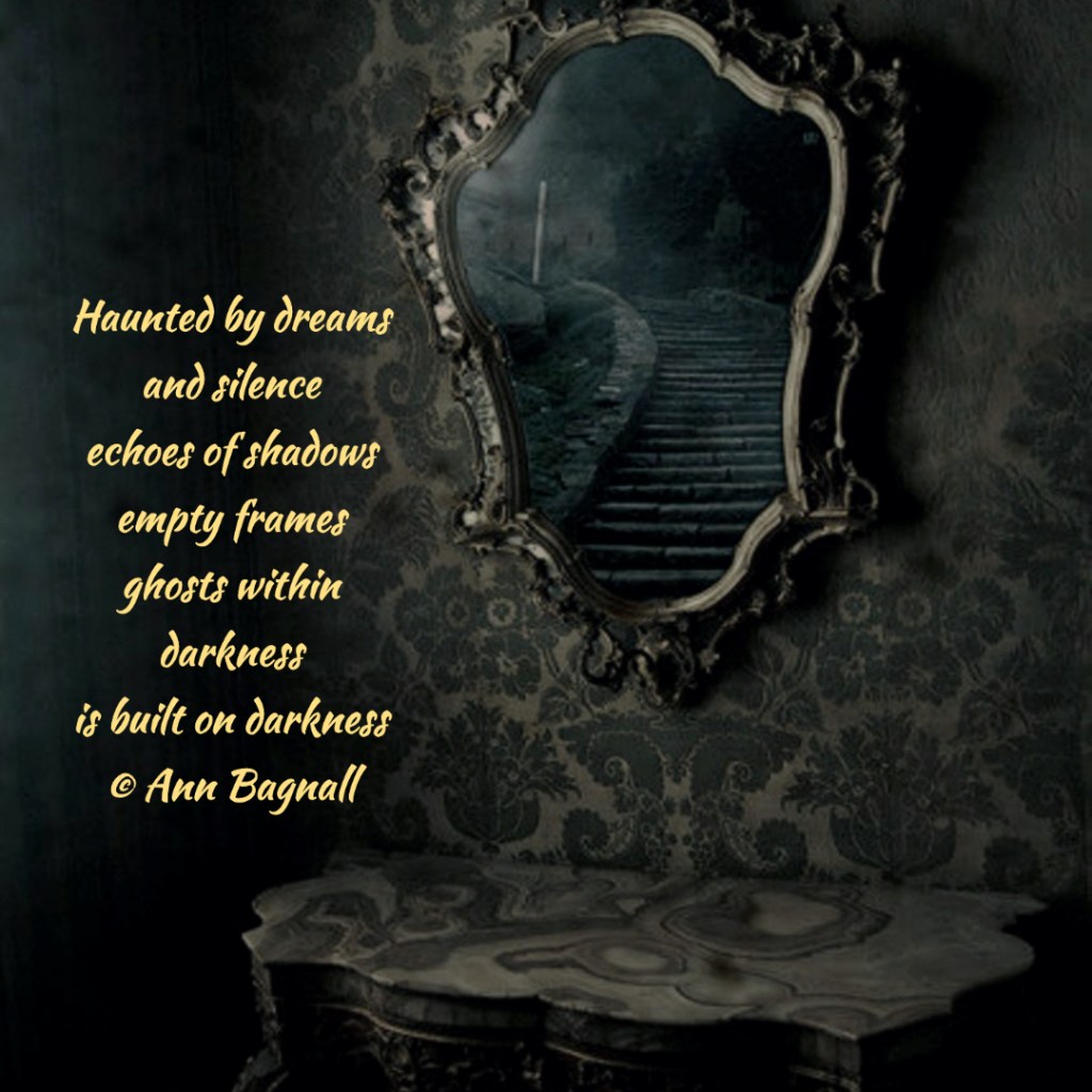 October 5, 2022September 6, 2022 Haunted by dreamsand silenceechoes of shadowsempty framesghosts withindarknessis built on darkness© Ann Bagnall Share this: Click to email a link to a friend (Opens in new window) Email Tweet Click to print (Opens in new window) Print Like Loading... Related