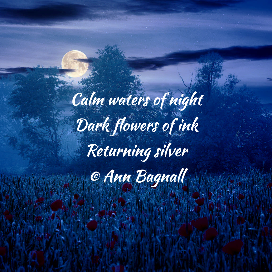 October 12, 2022October 5, 2022 Calm waters of nightDark flowers of inkReturning silver© Ann Bagnall Share this: Email a link to a friend (Opens in new window) Email Tweet Print (Opens in new window) Print Like Loading... Related