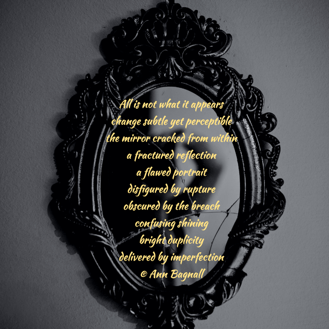 October 22, 2022October 5, 2022 All is not what it appearschange subtle yet perceptiblethe mirror cracked from withina fractured reflectiona flawed portraitdisfigured by ruptureobscured by the breachconfusing shining bright duplicitydelivered by imperfection © Ann Bagnall Share this: Click to email a link to a friend (Opens in new window) Email Tweet Click to print (Opens in new window) Print Like Loading... Related