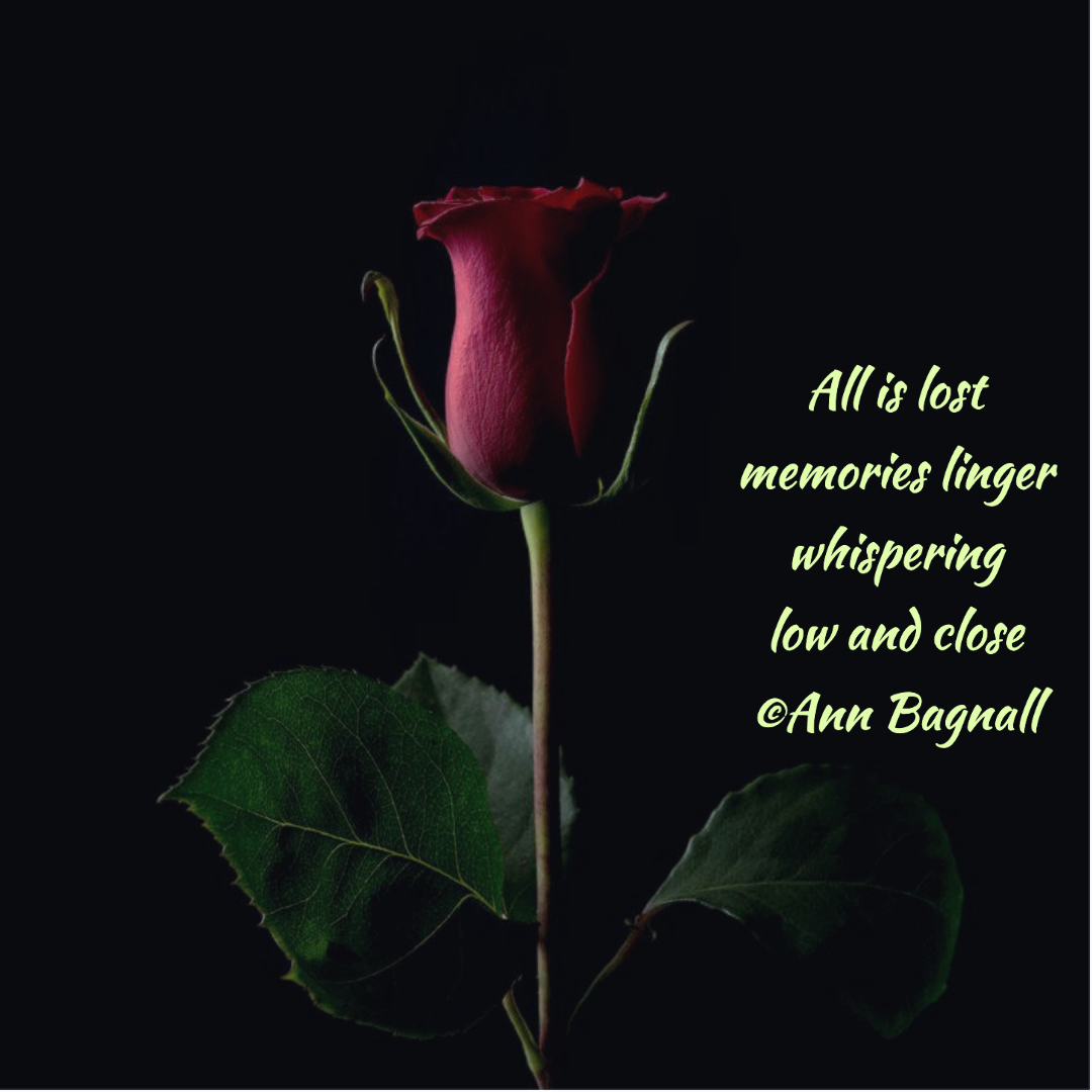 October 30, 2022October 5, 2022 All is lost memories linger whispering low and close ©Ann Bagnall Share this: Click to email a link to a friend (Opens in new window) Email Tweet Click to print (Opens in new window) Print Like Loading... Related