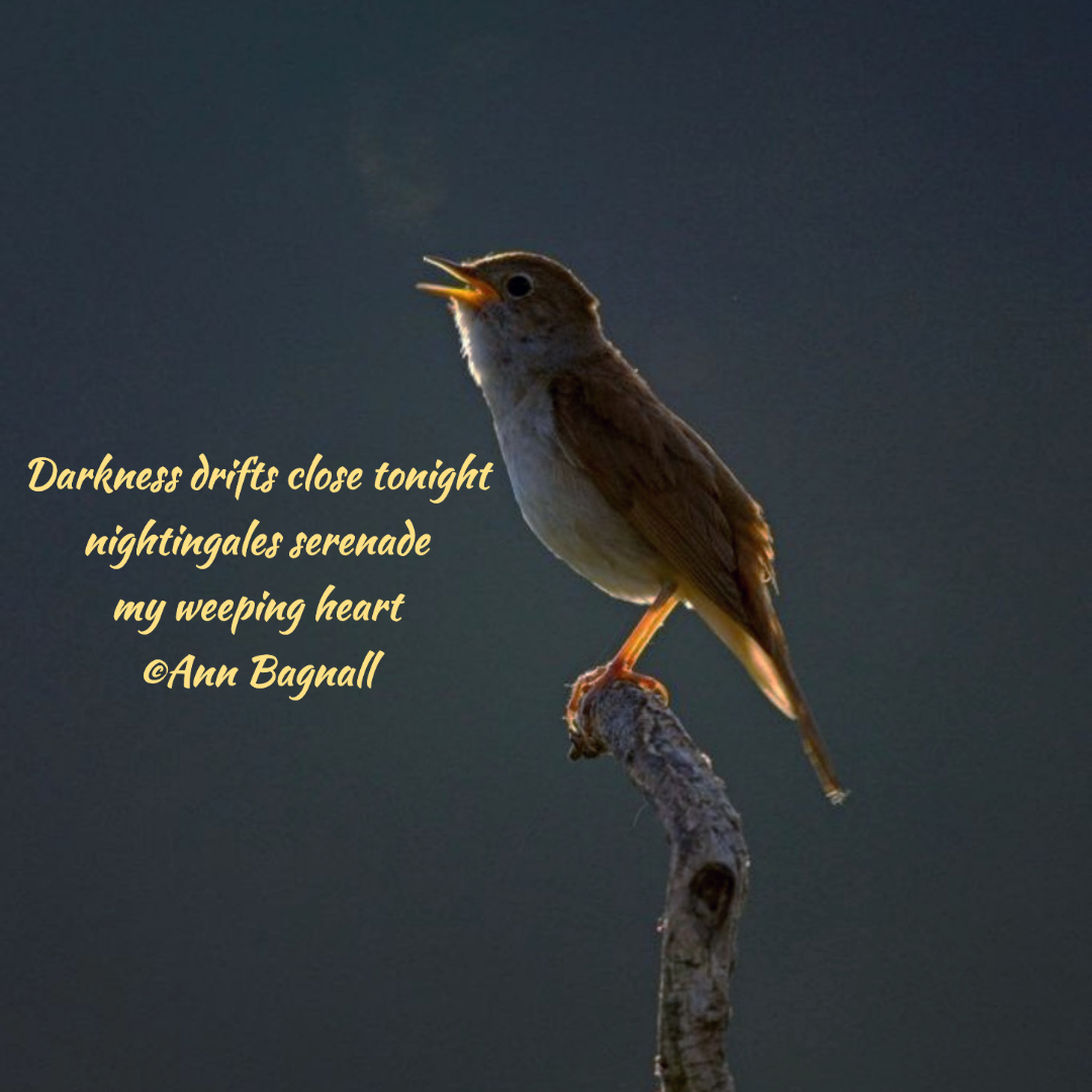 October 30, 2022October 5, 2022 Darkness drifts close tonightnightingales serenademy weeping heart©Ann Bagnall Share this: Click to email a link to a friend (Opens in new window) Email Tweet Click to print (Opens in new window) Print Like Loading... Related