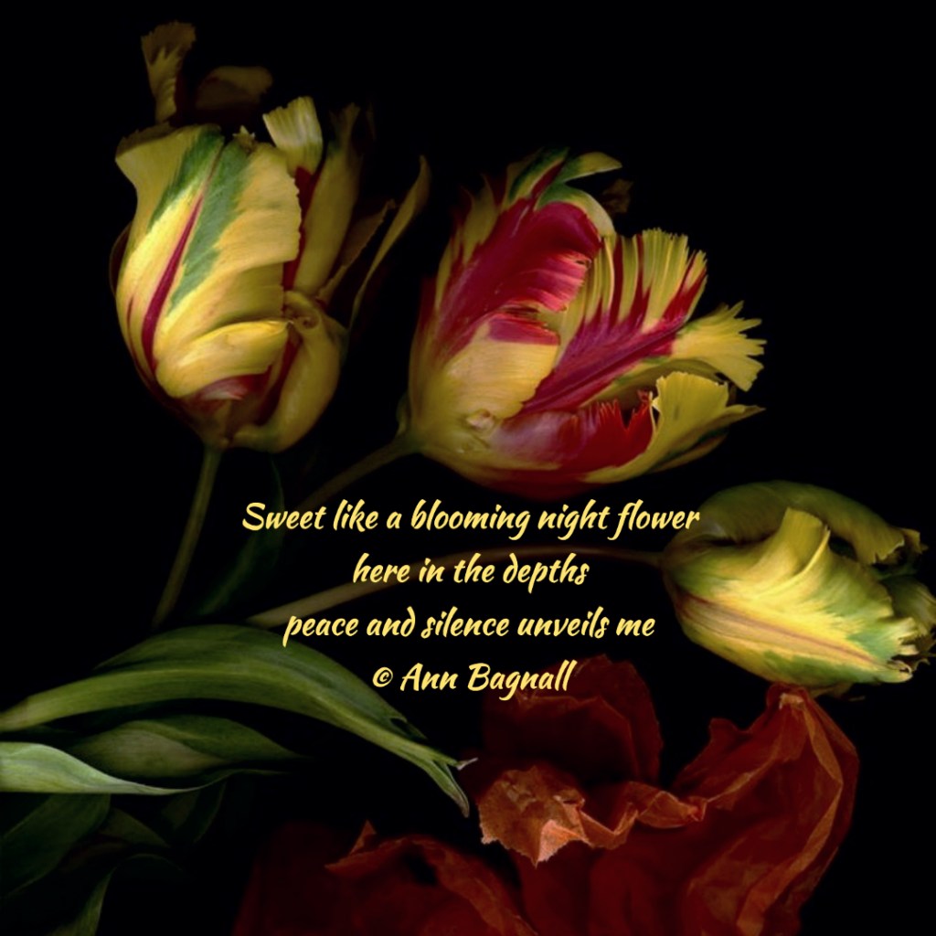 November 2, 2022December 28, 2024 Sweet like a blooming night flowerhere in the depthspeace and silence unveils me© Ann Bagnall Share this: Click to email a link to a friend (Opens in new window) Email Tweet Click to print (Opens in new window) Print Like Loading... Related
