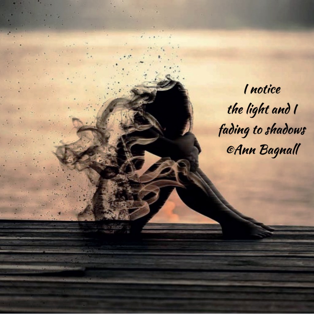 November 2, 2022October 13, 2022 I notice the light and I fading to shadows ©Ann Bagnall Share this: Click to email a link to a friend (Opens in new window) Email Tweet Click to print (Opens in new window) Print Like Loading... Related