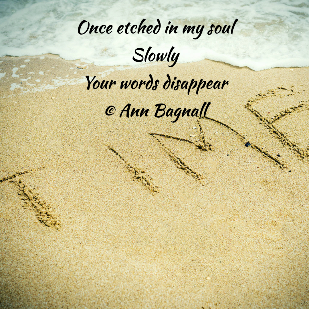 November 7, 2022October 29, 2022 Once etched in my soulSlowlyYour words disappear© Ann Bagnall Share this: Click to email a link to a friend (Opens in new window) Email Tweet Click to print (Opens in new window) Print Like Loading... Related
