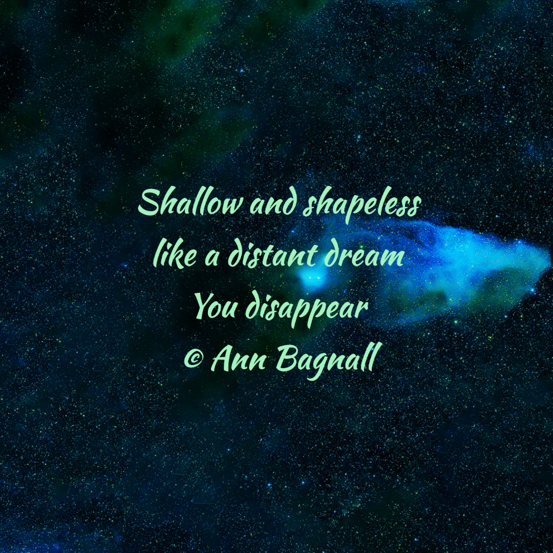 November 7, 2022October 29, 2022 Shallow and shapelesslike a distant dreamYou disappear© Ann Bagnall Share this: Click to email a link to a friend (Opens in new window) Email Tweet Click to print (Opens in new window) Print Like Loading... Related