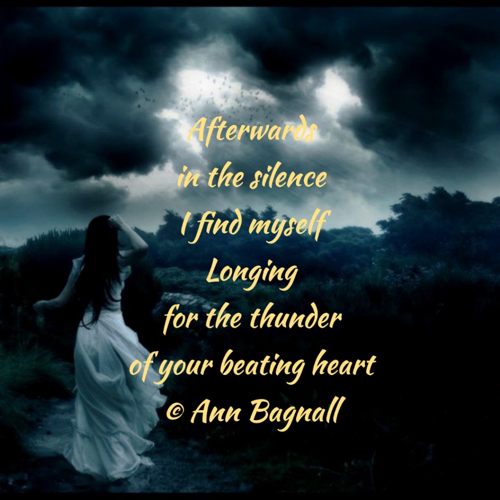 November 18, 2022November 21, 2022 Afterwardsin the silenceIn find myselflongingfor the thunderof your beating heart Share this: Click to email a link to a friend (Opens in new window) Email Tweet Click to print (Opens in new window) Print Like Loading... Related