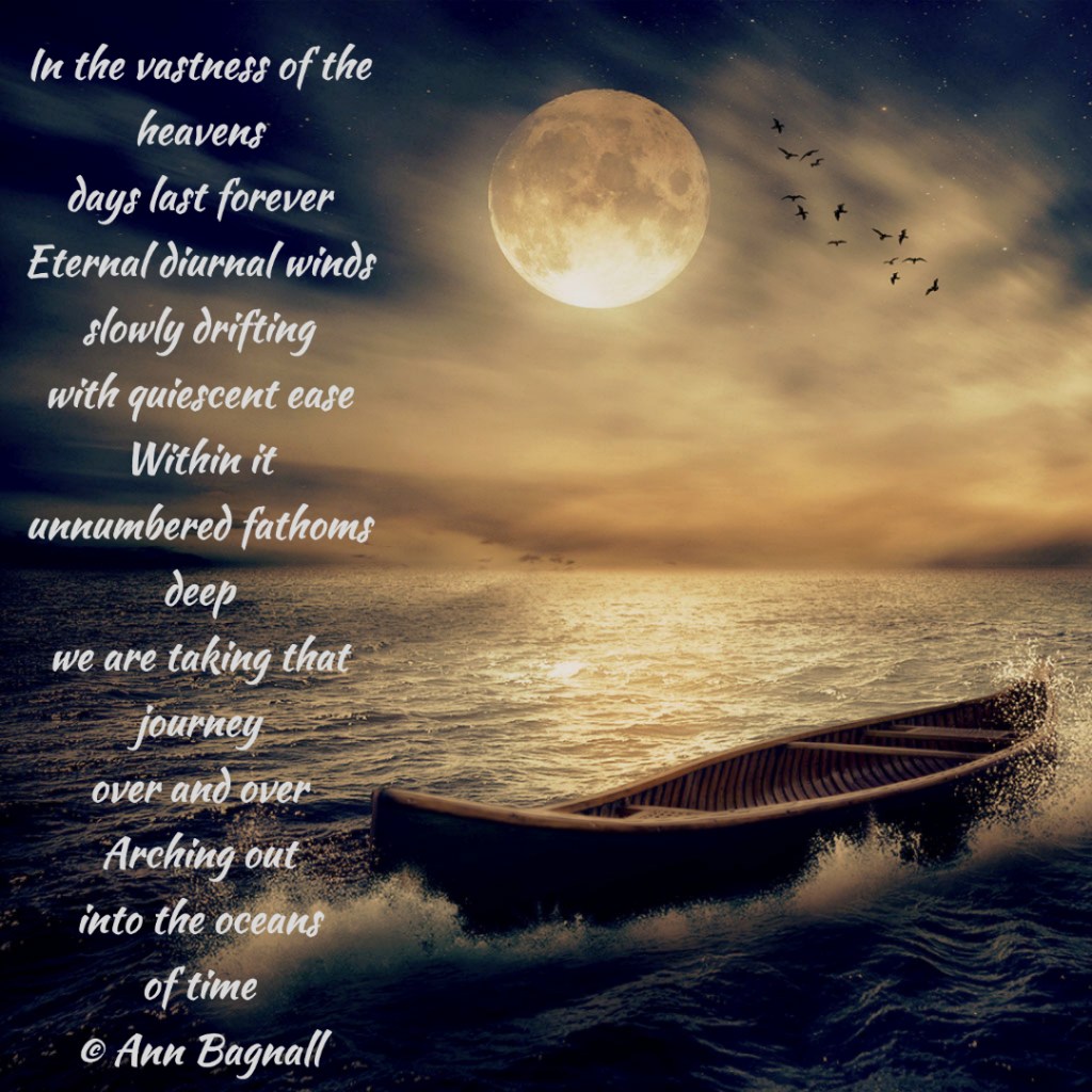 November 22, 2022November 21, 2022 In the vastness of the heavensdays last foreverEternal diurnal windsslowly driftingwith quiescent easeWithin itunnumbered fathoms deepwe are taking that journeyover and overArching outinto the oceansof time© Ann Bagnall Share this: Click to email a link to a friend (Opens in new window) Email Tweet Click to print (Opens in new window) Print Like Loading... Related